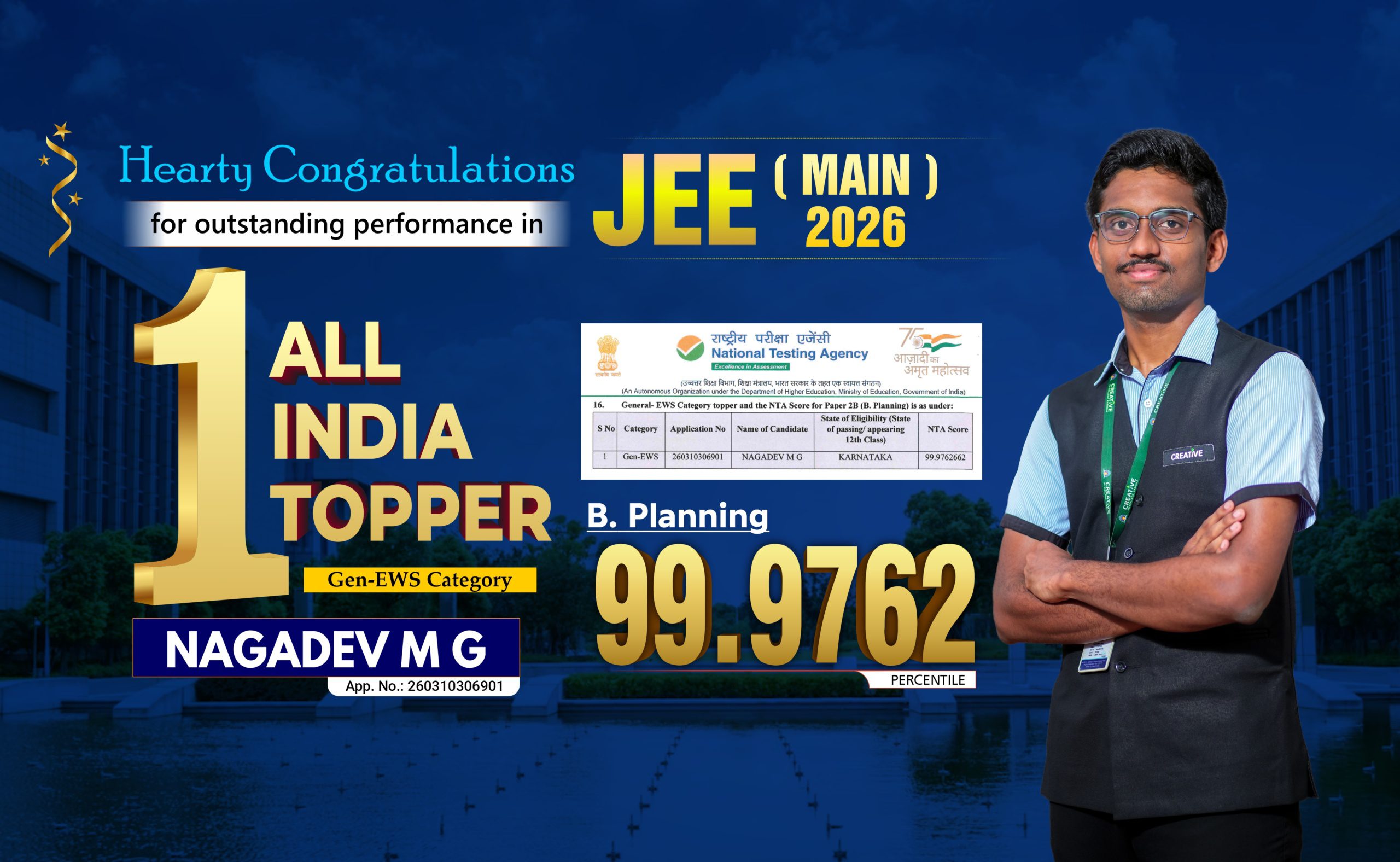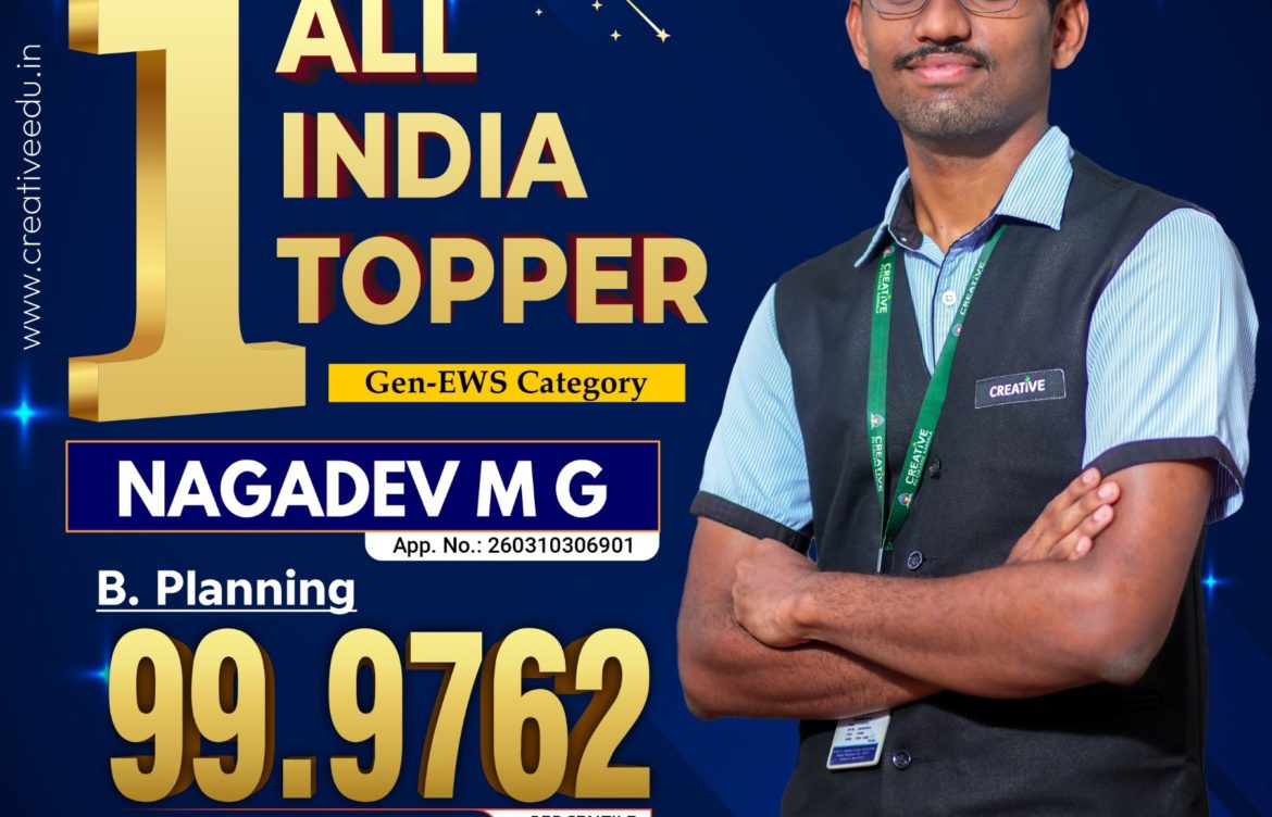 ಕ್ರಿಯೇಟಿವ್ ಕಾಲೇಜಿನ ನಾಗಾದೇವ್ ಎಂ.ಜಿ. ಬಿ ಪ್ಲಾನಿಂಗ್ ನಲ್ಲಿ ಜನರಲ್ EWS ವಿಭಾಗದಲ್ಲಿ ದೇಶಕ್ಕೆ ಪ್ರಥಮ ಸ್ಥಾನ.