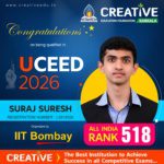 ದೇಶದ ಅತ್ಯುನ್ನತ ತಾಂತ್ರಿಕ ಶಿಕ್ಷಣ ಸಂಸ್ಥೆಯಾದ ಐಐಟಿ ಮುಂಬೈ , ಐಐಟಿ ದೆಹಲಿ, ಐಐಟಿ ಗುವಾಹಟಿ, ಐಐಟಿ ಹೈದರಾಬಾದ್, ಐಐಟಿ ರೂರ್ಕಿ ಮತ್ತು ಐಐಟಿ ಜಬಲಪುರ್ ಸಂಸ್ಥೆಗಳಿಗೆ ಬ್ಯಾಚುಲರ್ ಆಫ್ ಡಿಸೈನ್ ಕೋರ್ಸ್ ಗೆ ಪ್ರವೇಶ ಬಯಸುವ ವಿದ್ಯಾರ್ಥಿಗಳಿಗೆ 2026 ಜನವರಿ 18 ರಂದು ನಡೆದ ಯು.ಸಿ.ಇ.ಇ.ಡಿ (UCEED)ಪ್ರವೇಶ ಪರೀಕ್ಷೆಯಲ್ಲಿ ಕಾರ್ಕಳದ ಕ್ರಿಯೇಟಿವ್ ಕಾಲೇಜಿನ ಸೂರಜ್ ಸುರೇಶ್ ರಾಷ್ಟ್ರಮಟ್ಟದಲ್ಲಿ ಜನರಲ್ ವಿಭಾಗದಲ್ಲಿ 518 ರ‍್ಯಾಂಕ್ ಪಡೆದುಕೊಂಡಿದ್ದಾರೆ. ವಿದ್ಯಾರ್ಥಿಗಳಾದ ಭೂಮಿಕಾ ವೈ OBC- NCL ವಿಭಾಗದಲ್ಲಿ 1378 ನೇ ರ‍್ಯಾಂಕ್, ಸಂಕೀರ್ತ್ ರಾಜ್ ಕೆ. ಜಿ.1381ನೇ ರ‍್ಯಾಂಕ್ , ಚಿರಂತ್ ಕೆ.ಎನ್.OBC-NCL ವಿಭಾಗದಲ್ಲಿ 1507ನೇ ರ‍್ಯಾಂಕ್ ಪಡೆದುಕೊಂಡು ಮುಂದಿನ ಹಂತದ ಕೌನ್ಸೆಲಿಂಗ್ ಪ್ರಕ್ರಿಯೆಗೆ ಅರ್ಹತೆಯನ್ನು ಪಡೆದುಕೊಂಡಿದ್ದಾರೆ.